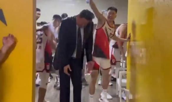 為了慶祝季后賽拿到名額,球員們在更衣室里面舉著礦泉水瓶不斷朝李楠潑水,而發起帶頭的正是李楠的兒子李祿瞳,其他的教練組都在門外看這一幕,整個場面顯得極為歡樂。而當其他人都撤了閆時一個人還在不斷的向李楠潑水,最終教練一身名牌的西裝被澆得渾身濕透,雖然成了落湯雞,但是臉上也是十分開心