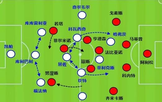 切爾西的三中衛體系下,中場不只是三名中前衛,哈弗茨和菲利克斯也可以是中場。所以他們在攻防轉換時,既有著極強的中圈對抗效率,也有著極快的攻防轉換速度。切爾西的中場傳球明快精準和帶球向前快速犀利,相比于利物浦的傳球,更為出色。另外,切爾西三名中衛的出球能力也很強,使得利物浦的高位壓迫效果不佳,一旦放出空間給對方傳球,反倒是問題很大。