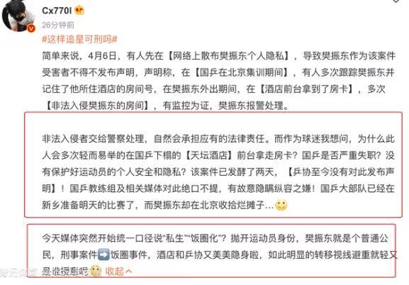 國乒奧運冠軍樊振東遭遇跟蹤騷擾和房間非法入侵事件,引發球迷和媒體的廣泛關注。據報道,樊振東因此次事件留在北京配合警方調查,無法前往河南新鄉備戰冠軍賽。對此,樊振東的真粉絲球迷對中國乒協提出質疑,認為乒協沒有保護好運動員,甚至在推卸責任。此事引發了球迷和媒體的關注,讓人們重新思考運動員的人身安全問題。