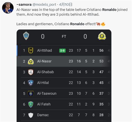在C羅將沙特聯賽的處子之秀完成之前,利雅得勝利是以兩分的分差處于優勢領跑的地位,但是出場的一共10場聯賽賽事當中利亞的勝利拿到了7勝2平1負,因此積分榜上被吉達聯合成功反超了分數,而此前利雅得勝利在沙特的超級杯賽事當中,以1:3的比分敗于吉達聯合的隊伍。