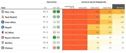 2022-23賽季歐冠1/4決賽首回合已全部結束,曼城3-0戰勝拜仁,國米2-0擊敗本菲卡,皇馬2-0戰勝切爾西,AC米蘭1-0擊敗那不勒斯。根據相關數據網站更新的預測結果,曼城進入決賽的概率為67%,奪冠概率為51%,皇馬奪冠的概率為18%。