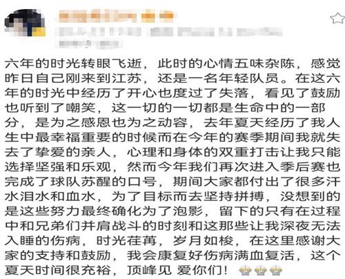 在社交平臺(tái)上所發(fā)布的文章,大致的內(nèi)容就是表示對(duì)這6年來到江蘇對(duì)時(shí)光的感慨,這期間也遭受了病痛的折磨和親人的離去,江蘇賽能夠成功進(jìn)入進(jìn)后賽,是完成了球隊(duì)蘇醒的這一口號(hào),期間大家都付出了眾多的努力,同時(shí)也表示自身會(huì)好好的康復(fù),再和大家一起戰(zhàn)斗。
