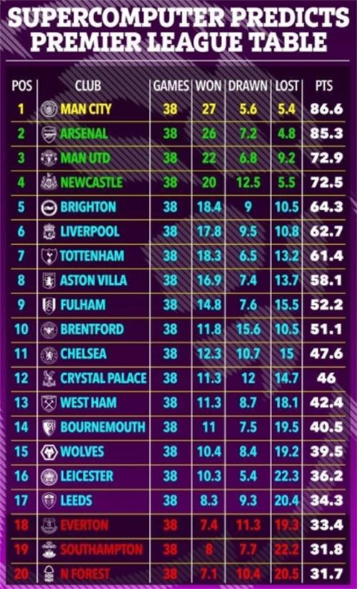 在積分榜末端,埃弗頓、南安普頓和諾丁漢森林最終被預測將降級。這對于這些球隊來說是一個沉重的打擊,但也表明了這個賽季英超聯賽的競爭激烈程度。