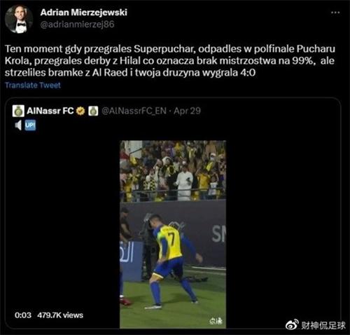 北京時(shí)間的5月2日,在中超聯(lián)賽河南隊(duì)效力的外援阿德里安梅耶澤夫斯基在個(gè)人社交媒體公開(kāi)發(fā)文嘲諷C羅,他聲稱(chēng)C羅所在的球隊(duì)目前都已經(jīng)在賽季四大皆空,自己打進(jìn)一個(gè)無(wú)關(guān)緊要的球竟然還要瘋狂的慶祝,在此次發(fā)文中還轉(zhuǎn)發(fā)了利雅得勝利的一則動(dòng)態(tài),該動(dòng)態(tài)中的內(nèi)容是C羅攻破對(duì)手球門(mén)之后的慶祝視頻。