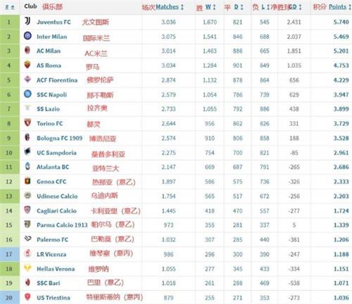 回顧整個意甲歷史積分榜,這些球隊的排名和得分反映了意甲聯賽的發展和競爭。北方三強的統治地位表明他們在意大利足球中的長期優勢,而其他球隊的崛起也為意甲注入了新的活力和激情。