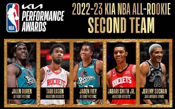 而最佳新秀陣容二陣的名單則為:杰倫-杜倫(活塞隊)、塔里-伊森(火箭隊)、杰登-艾維(活塞隊)、小賈巴里-史密斯(火箭隊)和杰里米-索漢(馬刺隊)。