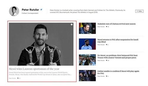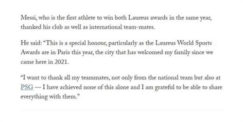 根據(jù)Peter Rutzler在The Athletic的報(bào)道,梅西在勞倫斯頒獎(jiǎng)禮上獲得年度最佳男運(yùn)動(dòng)員獎(jiǎng)。在梅西的獲獎(jiǎng)感言中,他特別提到了巴黎這座城市對(duì)他和他的家人的熱情歡迎。