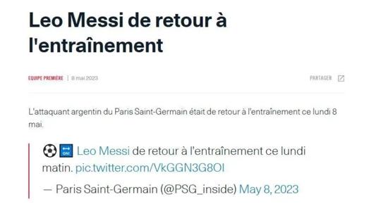 5月8日,巴黎官方在動態中曬出梅西重返訓練場的照片,此次動態表明梅西已經提前解除先前停賽兩周的禁令,重新返回了賽場訓練迎戰接下來的法甲聯賽,此前多家媒體報道,梅西由于沙特之行缺席了巴黎在訓上周一隊內訓練,隨后巴黎俱樂部便決定對梅西處以停賽,停薪,停訓的三項處罰,此次的處罰時間為兩周期限。