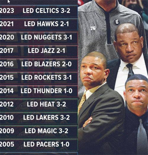昨天的東部半決賽第七場比賽中,費城76人隊慘遭淘汰,最終以3-4的總比分不敵波士頓凱爾特人隊。這也是76人隊主帥道格·里弗斯執(zhí)教生涯中第12次在系列賽中被逆轉(zhuǎn)。具體記錄如下: