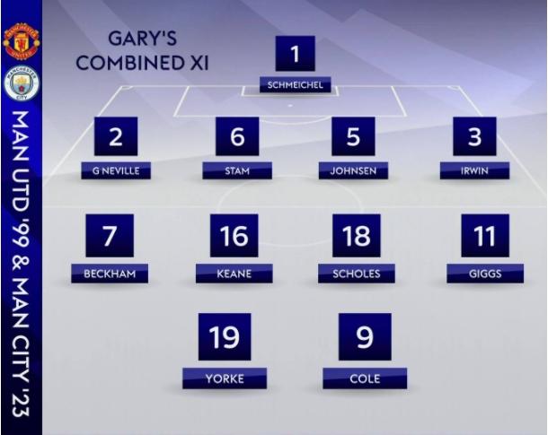 在內維爾評選的99曼聯和23曼城合體最佳陣容中,門將位置被曼聯的舒梅切爾占據。后衛線上,內維爾選擇了自己和斯塔姆,以及約翰森和埃爾文。中場則是貝克漢姆、基恩、斯科爾斯和吉格斯。最后,前鋒線上有約克和科爾。這個陣容完全由曼聯球員組成,展現了他們在99年和23年時期的出色表現。
