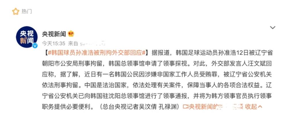 5月12日,韓國外援孫準浩在上海機場試圖出境的時候被警方拘捕,正式接受遼寧省朝陽市公安機關的拘留調查,后續我國外交部向外界確認了此消息,在外交部發出的通告中可以看到,韓國公民孫準浩因涉嫌非國家工作人員受賄罪被警方逮捕調查,此次案件,遼寧省公安機關已經向韓國駐遼寧省總領事館發出了通報。