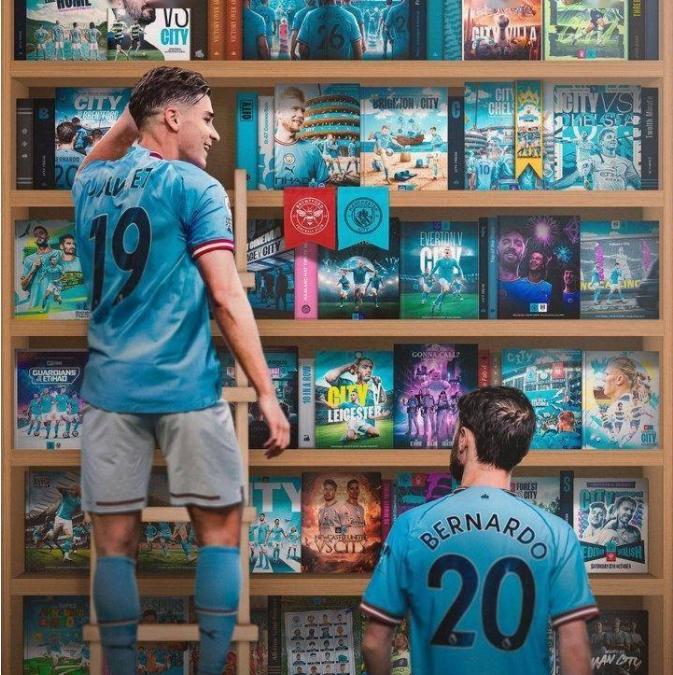 這張官方海報展示了曼城輝煌的戰績和精彩的瞬間。海報中的主角分別是阿爾瓦雷斯和貝爾納多-席爾瓦,兩位球員被譽為曼城的核心之一。他們在海報中挑選了本賽季的過往比賽的海報,回顧了藍月亮在英超聯賽中的輝煌戰績。
