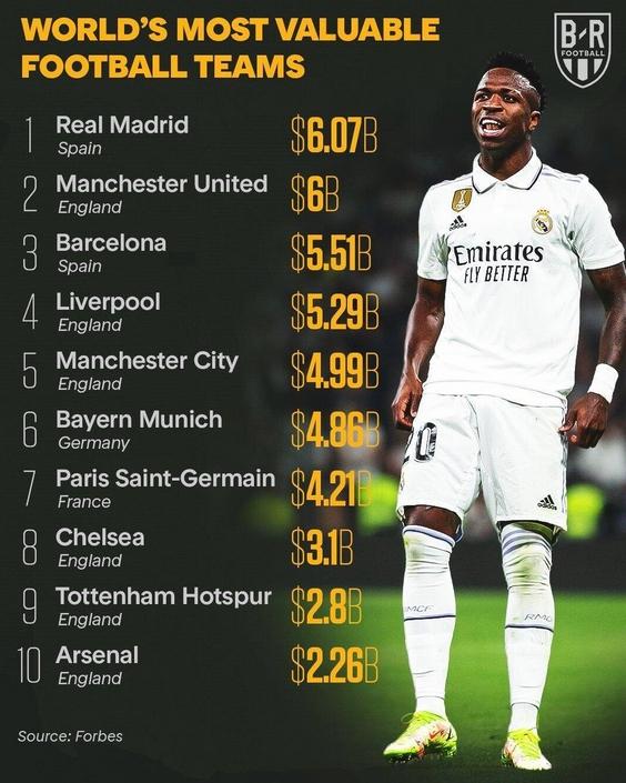 最近,福布斯雜志公布了2023年度最具價值足球隊榜單,讓球迷們對俱樂部的價值進行了一次盤點。排名第一的是西甲豪門皇家馬德里,該俱樂部估值高達60.7億美元,成為當今足壇最值錢的俱樂部。而英超豪門曼聯緊隨其后,以強大的商業價值聞名,盡管近年來成績不佳,但估值仍高達60億美元。人們紛紛開玩笑說,如果曼聯在過去十年沒有經歷動蕩,而是贏得了英超和歐冠等重要冠軍,俱樂部價值達到100億美元也不會讓人意外。