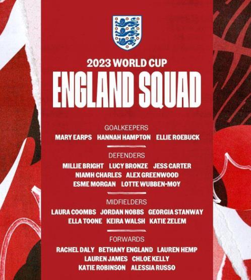 根據(jù)直播吧的報道,中國女足在世界杯小組賽中將面對英格蘭女足,而英格蘭女足已率先公布了參賽大名單,其中包括眾多知名球員。