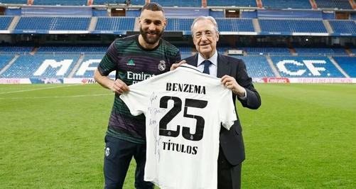 賽后,本澤馬向俱樂部主席弗洛倫蒂諾獻(xiàn)上了一件特殊的禮物。這件球衣上印有25個冠軍的標(biāo)志,象征著本澤馬在皇馬效力期間所獲得的輝煌成就。他還在球衣上寫下了簡短而深情的字句:“獻(xiàn)給我的主席,KB9”。