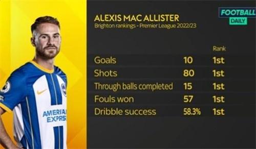 除了在2022年卡塔爾世界杯上有亮眼的比賽之外,麥卡利斯特在本賽季的表現也很不錯,2022-23賽季他一共代表布萊頓俱樂部出場40次,共打進12個球和3次助攻,成功幫助球隊獲得了下個賽季參加歐聯杯的資格。據統計,麥卡利斯特在本賽季有6項數據非常突出,均在布萊頓球隊第一位,分別是進球數、射門數、射正數、禁區贏得球權數、直塞次數、制造對方犯規次數。