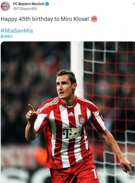 拜仁官方賬號在社交媒體上發布了克洛澤在效力球隊期間的照片,并寫道:“祝克洛澤45歲生日快樂。”