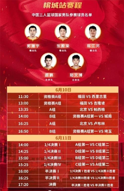 在比賽前夕,中國三人籃球國家男隊發布了檳城站的比賽賽程。賽程圖中顯示的時間均為北京時間。這次比賽對于中國隊來說是一個重要的挑戰,參賽隊員們需要全力以赴,展現出自己的實力和技巧。
