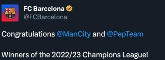 比賽結束后,巴塞羅那和拜仁慕尼黑的官方賬號第一時間向曼城和瓜迪奧拉發送了祝福。這也帶有一些有趣的因果關系,因為瓜迪奧拉此前曾兩度率領巴塞羅那獲得歐冠冠軍,但在執教拜仁期間并未能進一步突破。而在本賽季的歐冠征程中,瓜迪奧拉的曼城正是親手終結了拜仁的晉級夢想,他們在1/4決賽中以總比分4-1淘汰了拜仁,此前拜仁在小組賽階段連勝國米、巴塞羅那和巴黎。