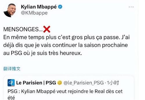 在兩年之后,姆巴佩似乎已經下定了決心,書面通知巴黎自己將不會繼續和球隊續約,正在多家媒體認為,他有可能離開隊伍展會的時候,姆巴佩又在社交平臺上發文,他再次重申自己在下個賽季將會繼續留在巴黎,表示網上有關自己轉會皇家馬德里的說法,完全是錯誤的言論。