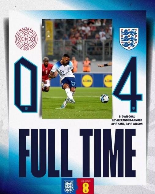 比賽進行到第8分鐘,英格蘭就取得了領先。薩卡在對手禁區右側將球掃向中路,然而馬耳他球員阿帕普在薩卡的干擾下不慎將球擋進了自家大門,為英格蘭開了個好頭。接下來,阿諾德展示了他的世界波射門能力,他在禁區弧頂右側一記精彩的遠射破門,幫助英格蘭將優勢擴大到2比0。凱恩也在第31分鐘的點球中命中,為球隊貢獻一分。最后時刻,替補出場的威爾遜利用點球機會再下一城,為英格蘭鎖定了勝局。