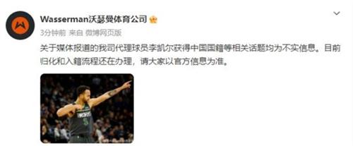 然而,根據(jù)國(guó)內(nèi)籃球記者宋翔的報(bào)道,李凱爾的經(jīng)紀(jì)團(tuán)隊(duì)相關(guān)負(fù)責(zé)人在20日表示,目前歸化與入籍過程仍在進(jìn)行當(dāng)中,這意味著凱爾-安德森獲得中國(guó)國(guó)籍的消息尚未得到官方確認(rèn)。與此同時(shí),李凱爾的經(jīng)紀(jì)公司沃瑟曼體育公司也發(fā)表聲明稱:“關(guān)于媒體報(bào)道的我司代理球員李凱爾獲得中國(guó)國(guó)籍等相關(guān)話題均為不實(shí)信息。目前歸化和入籍流程還在辦理,請(qǐng)大家以官方信息為準(zhǔn)。”