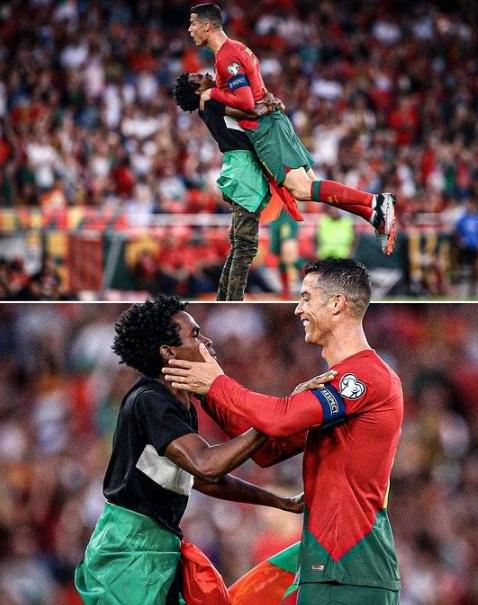 然而,這場比賽中發生了一個小插曲。一名球迷沖進球場,興高采烈地抱住C羅,跪地親吻了他的腳,并舉起他高高,模仿了C羅的經典慶祝動作。當安保人員上場試圖將他帶離時,他舉著葡萄牙國旗在球場上高興地奔跑。