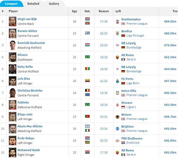 以下是利物浦隊史引援紀(jì)錄(單位:歐元):