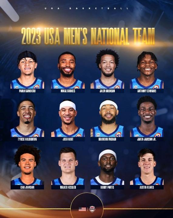 今年世界杯的美國男籃名單包括保羅-班切羅(魔術)、米卡爾-布里奇斯(籃網)、杰倫-布倫森(尼克斯)、安東尼-愛德華茲(森林狼)、泰勒斯-哈利伯頓(步行者)、約什-哈特(尼克斯)、布蘭登-英格拉姆(鵜鶘)、小賈倫-杰克遜(灰熊)、卡梅隆-約翰遜(籃網)、沃克-凱斯勒(爵士)、博比-波蒂斯(雄鹿)、奧斯汀-里夫斯(湖人)。