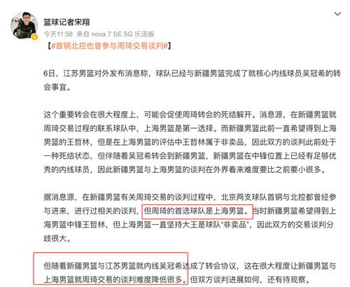 新疆隊伍官宣吳冠希加盟,這也間接推動了周琦被交易的步伐,目前新疆和上海正在商量有關交易上的方案,上海這邊并不想要將作為MVP的中鋒王哲林放入到此次教交易,如今新疆在前線擁有吳冠希對王哲林的需求已經(jīng)降低了,將吳冠希送出的江蘇男籃,在本次交易當中很好的幫助了一把上海隊伍。