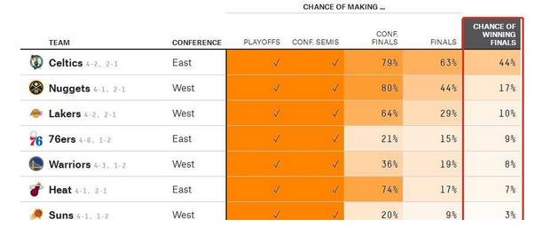 在半決賽中,排名第一的凱爾特人隊的勝率有所提高,目前達到了44%,這個數字令人驚訝。盡管凱爾特人隊只領先了2-1,但他們的表現看起來已經像是3-0領先了一樣。他們在東部決賽和季后賽的席位看起來是相對安全的。在哈登砍下45+分的情況下,76人隊勉強贏得了第一場比賽并不令人意外。但隨后MVP恩比德的回歸打亂了球隊的節奏,他們接連輸掉了2場比賽。對于冠軍球隊來說,穩定是非常重要的。對于像76人這樣的球隊來說,想要奪冠是非常困難的。他們的勝率也下降了超過20%,現在只有9%。