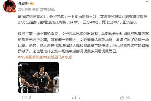 7月10日,在夏季聯(lián)賽當(dāng)中,文班亞馬第2場比賽14中9,甚至連續(xù)命中兩個3分,外加12個罰球7中,一度拿下了27分12籃板三蓋帽1個搶斷這樣優(yōu)秀的數(shù)據(jù)。本次的爆發(fā)也展現(xiàn)出了作為狀元的天賦,文班亞馬一度沖上了全美熱搜的第1名,引發(fā)眾多媒體方面的夸贊,之后馬刺的夏季聯(lián)賽主帥馬特內(nèi)爾森也表示并不確定文班亞馬在接下來夏季聯(lián)賽中是否會出戰(zhàn)。