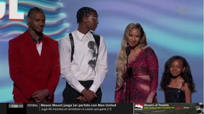 北京時間7月13日,ESPY頒獎典禮盛大舉行,籃球巨星詹姆斯榮獲年度最佳破紀錄表現獎,而他的妻子、兩個兒子和女兒也一同到場為他加油助威。
