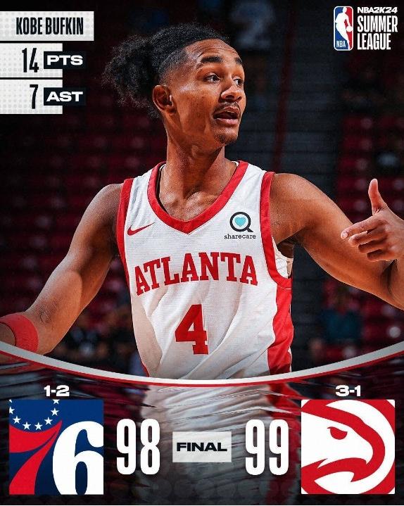 在另一場比賽中,老鷹以99-98險勝76人,比賽一直激烈地進行到最后時刻。老鷹的15號秀科比-巴夫金在最后時刻的后仰中投命中,完成了準絕殺。巴夫金全場得到14分和7次助攻。而76人的后衛斯普林格表現出色,貢獻了29分和3個籃板。