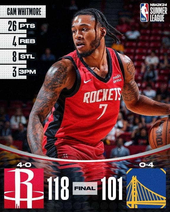 焦點之戰是火箭對陣勇士的比賽,火箭以118-101大勝對手。火箭隊在次節掀起了強勢進攻,贏得了17分的優勢,并成功確立了勝勢。火箭隊的20號秀惠特摩爾在本場比賽中發揮出色,全場拿下了26分、5籃板、1助攻和8次搶斷,成為白魔(Ball Mamba)的耀眼表現。
