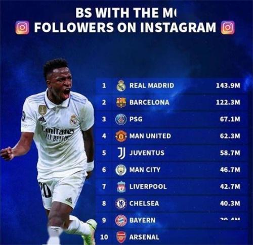 皇馬登頂榜單,其INS粉絲數高達1.439億人,成為全球關注度最高的足球俱樂部。作為西班牙豪門,皇馬擁有眾多忠實球迷,這也體現在社交媒體上的龐大粉絲數量。