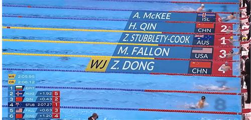 這場比賽覃海洋的狀態(tài)可以十分的不錯,在預選賽的成績里面,它是以2分09秒86進入的半決賽。在半決賽當中,他整整提升了兩秒的時間,成功進入到總決賽,在前50m的競技過程當中,覃海洋只是用了28秒70就成功的游玩一圈,并且排在了第一名,而日本選手緊隨其后,排在了第二名,在150m的過程當中,太陽排在了第二名,排在第一的是澳大利亞的選手。在最后快要到達終點的時候,覃海洋拼命的沖刺最還是沒有能夠超過澳大利亞選手,獲得了半決賽的第二名,總成績排在了第三名,成功進入決賽。