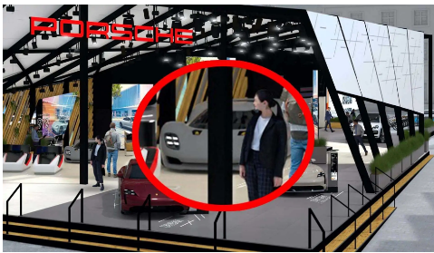 那是因為第二張照片雖然看起來像是對展會上保時捷展臺的無辜描繪,但實際上有一輛我們以前從未見過的銀色保時捷藏在左側的柱子后面。此外,它緊挨著寫著 919 Street 的背景。這很有趣,所以我們放大了更好看。