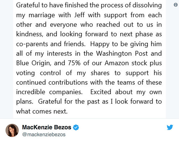 雖然讓出了投票權,但華爾街日報稱,根據亞馬遜的8934億美元的總市值估算,麥肯齊的股權價值超過350億美元,使得麥肯齊成為世界上最富有女性之一。在交代離婚進展之外,麥肯齊還在推文中稱,“我對自己的規劃感到興奮,對過去感到感激,也期待未來會發生什么。”