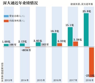 2018年,深大通實現營業收入25.91億元,盡管如此,深大通2018年依舊出現了歸母凈虧損23.49億元,同比減少756.46%。