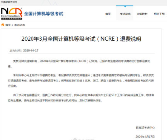 日前,教育部考試中心發(fā)布《2020年3月全國英語等級考試(PETS)退費說明》和《全國計算機等級考試(NCRE)退費說明》。對于兩項考試已報名的考生,繳納的考試費將進行全額退費處理。由于涉及考生數(shù)量較多,退費工作將分期分批進行,教育部考試中心中心將在自本說明發(fā)布之日起50個工作日內(nèi)完成退費工作。因疫情取消的全國英語、計算機等級考試將全額退費。