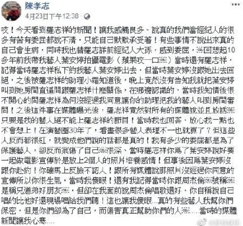 曾捧紅張柏芝、阮經(jīng)天等的經(jīng)紀(jì)人陳孝志曝羅志祥昔日曾想潛規(guī)則他旗下藝人葉安婷,稱在宣傳期時羅曾想約葉單獨出去,但被女方拒絕,事后羅經(jīng)紀(jì)人小霜還私自叫葉到房間審問,事件曝光后,羅志祥公開向媒體放話,只要是陳孝志帶的藝人絕不能上他的節(jié)目。