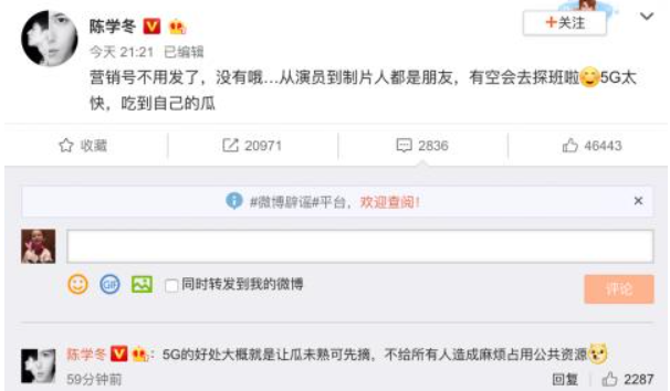 有趣的是,很多網友并不知道該爆料消息,陳學冬辟謠后,不少人提問“是什么瓜”,陳學冬則打趣回復:“5G的好處大概就是讓瓜未熟可先摘,不給所有人造成麻煩占用公共資源。”