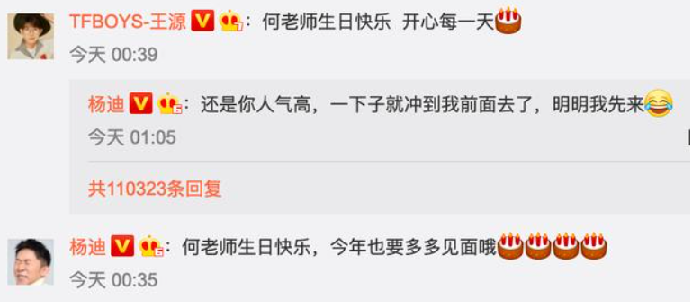 4月28日是何炅的生日,楊迪在何炅的微博評論區(qū)送上祝福:“何老師生日快樂,今年也要多多見面哦”。而隨后王源[微博]也暖心為何炅慶生:“何老師生日快樂,開心每一天”。隨著粉絲點(diǎn)贊和評論量的上漲,王源的評論位置逐漸上升到了楊迪祝福的前排,隨后楊迪在下面評論王源表示“不服”,稱:“還是你人氣高,一下子就沖到我前面去了,明明我先來”,畫面搞笑十足。