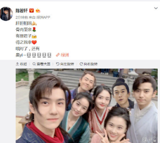 4月28日,電視劇《有翡》主演陳若軒在綠洲曬出主演的自拍照慶祝殺青,并配文:“有友相伴,肝膽相照,骨肉至親,有匪君子,得之我幸,哦對了,還有奧yi~”。照片中,照片中《有翡》男女主角趙麗穎[微博]、王一博[微博]同框 ,張慧雯[微博]、周潔瓊[微博]、張昕宇也對著鏡頭開心地笑,還把不在場的冷紀元也p在了照片中。有趣的是,王一博執鏡似乎有點手抖,照出來的合影有些模糊了。隨后,張慧雯、周潔瓊也在微博曬出了同款照。