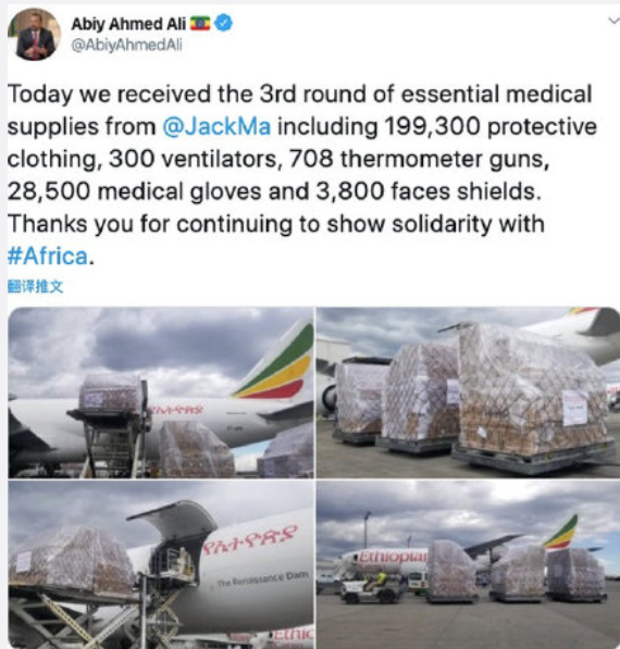 非洲當(dāng)?shù)貢r(shí)間4月27日,埃塞俄比亞總理阿比在社交媒體上發(fā)文:“”謝謝馬云繼續(xù)團(tuán)結(jié)與非洲在一起!”為開始接收來自馬云的第三批援助非洲應(yīng)急醫(yī)療物資表示感謝。@鄉(xiāng)村教師代言人-馬云 在4月20日曾宣布,馬云公益基金會(huì)和阿里巴巴公益基金會(huì)與非洲聯(lián)盟(非盟)合作,提供第三批應(yīng)急物資捐贈(zèng)。
