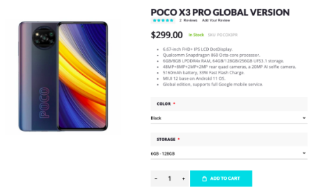 POCO X3 Pro有兩種顏色,即黑色和藍色,以及兩種存儲方式,即6GB + 128GB和8GB + 256GB。全球版POCO X3 Pro在Giztop的售價為299美元。