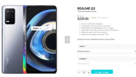 Realme Q3,Realme Q3 Pro和Realme Q3i已在中國亮相,作為該公司新的支持5G預算的智能手機。現在,可以看到前者在Giztop上以$ 239.00的低價預購。由Snapdragon 750G SoC提供支持,配備三重后置攝像頭和用于自拍攝像頭的打孔切口。