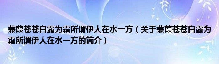本文關(guān)于蒹葭蒼蒼白露為霜所謂伊人在水一方的簡(jiǎn)介就講解完畢,希望對(duì)大家有所幫助。