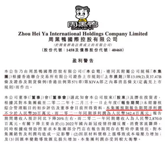 近日,號稱“羅美三巨頭”的絕威、周黑鴨和皇上皇相繼發布了業績預告。周黑鴨業績大跌超90% 2月13日晚間,周黑鴨發布盈利預警,預計2022年公司總營收同比下降約20%,公司總營收同比下降20%左右。 2021年營收28.7億元。